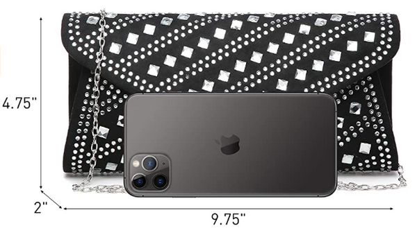 - Size is 9.75"W x 4.75"H x 2"D, with 44'' detachable chain shoulder strap